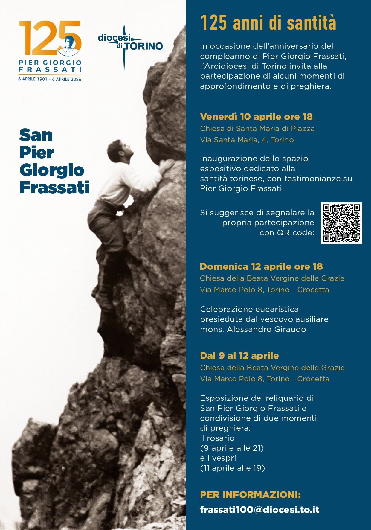 Esposizione del reliquario di San Pier Giorgio Frassati e condivisione di due momenti di preghiera: il rosario (9 aprile alle 21) e i vespri (11 aprile alle 19)